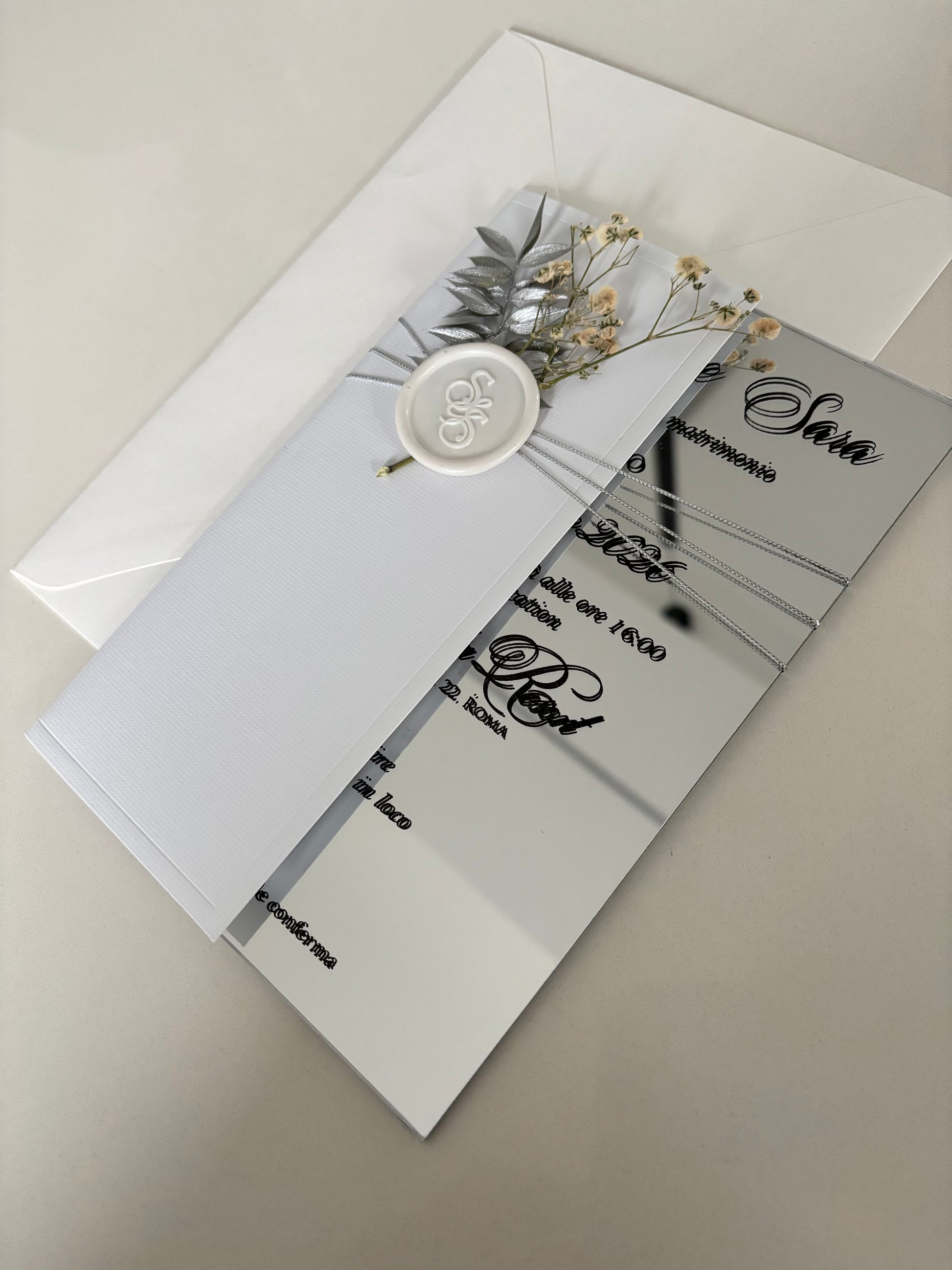 Partecipazione con fiori secchi e sigillo in ceralacca con iniziali sposi