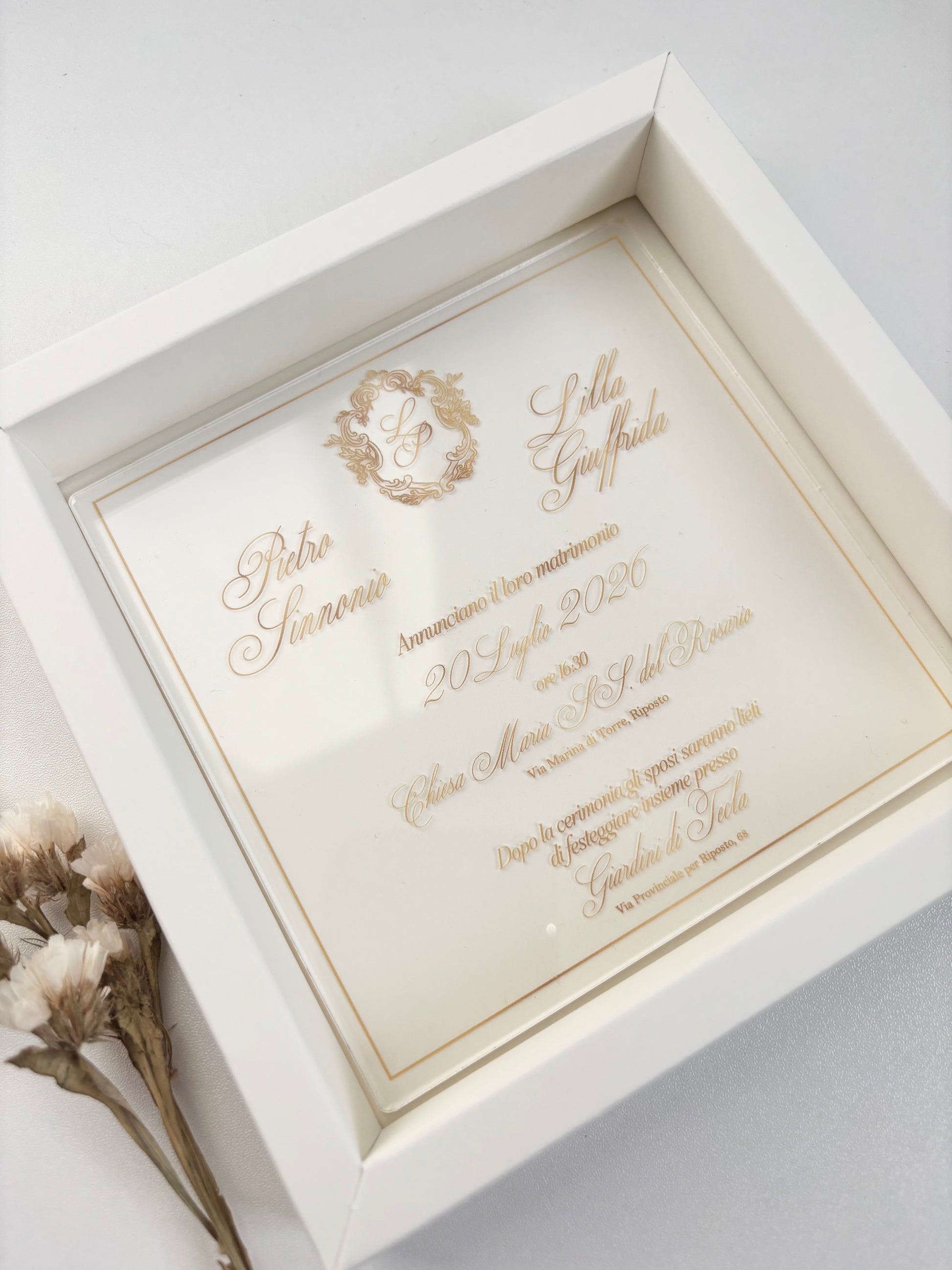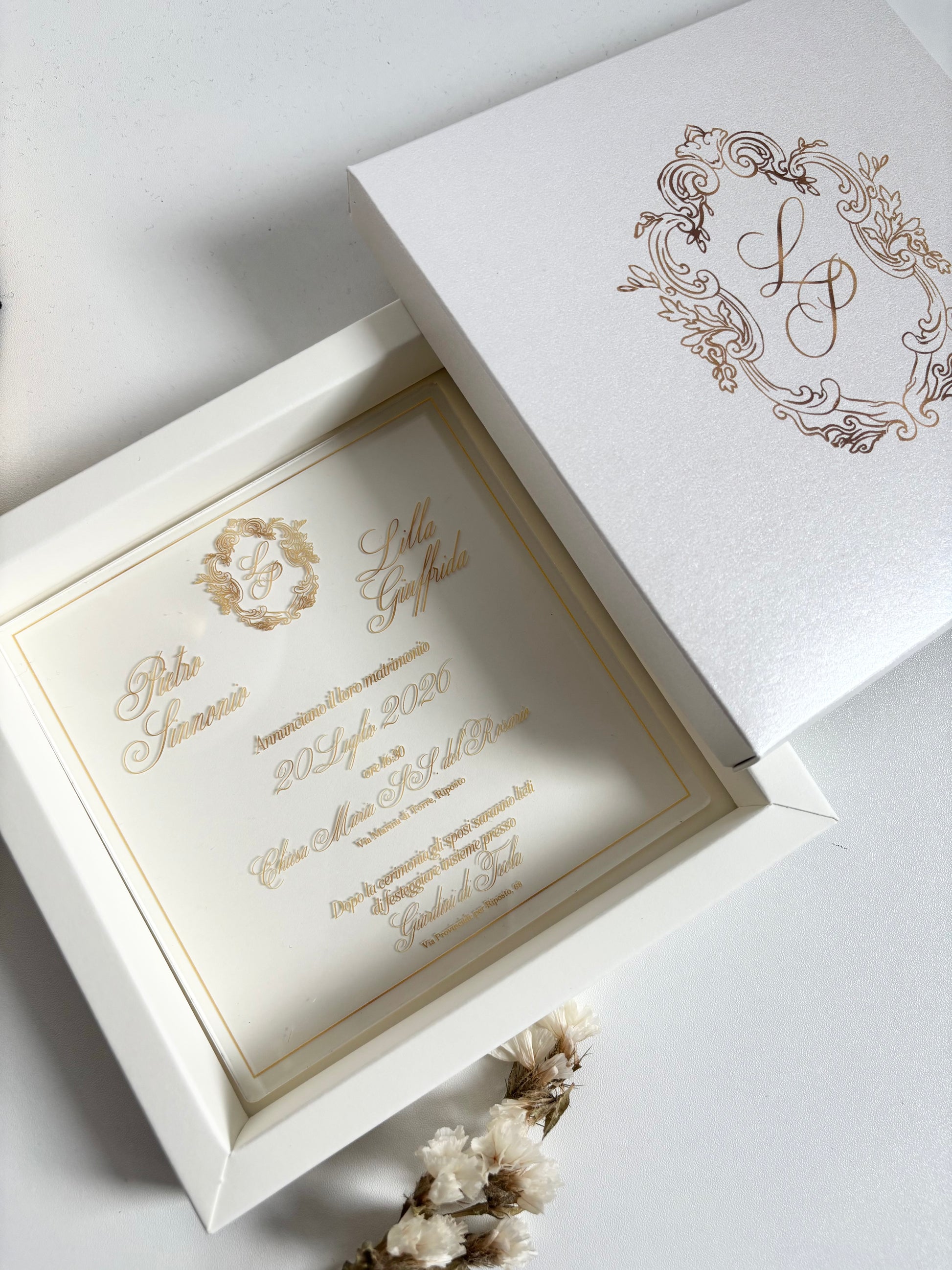 Partecipazione plexiglass trasparente in scatola (in foto scatola bianco perlato)